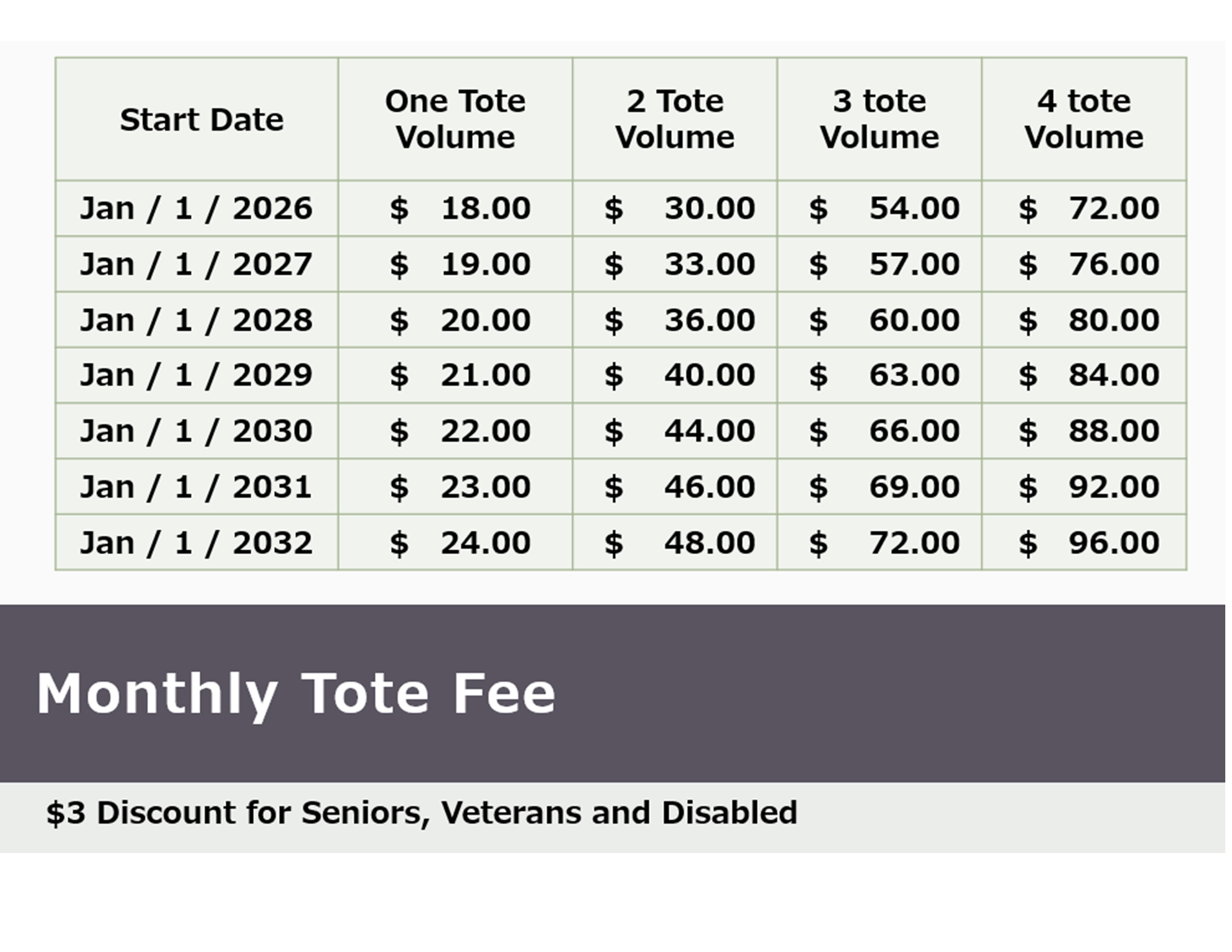 Bulk Item service fee schedule: